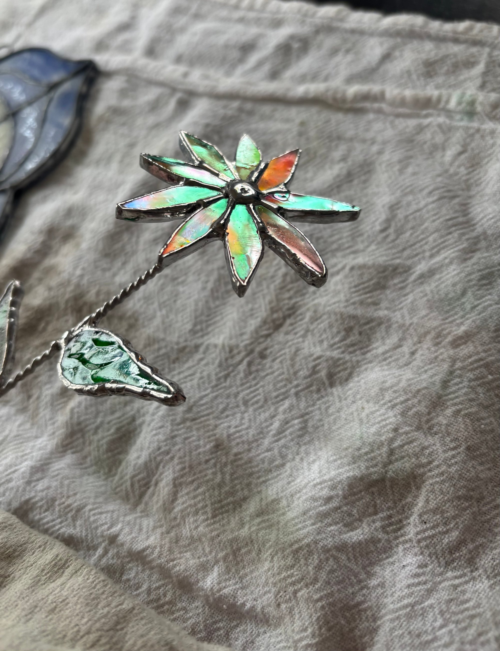 multi shaped and colored glasses, most flowers are palm sized and on solid copper wire that can be bent to desired presentation. Also leaves can be added to produce a bouquet