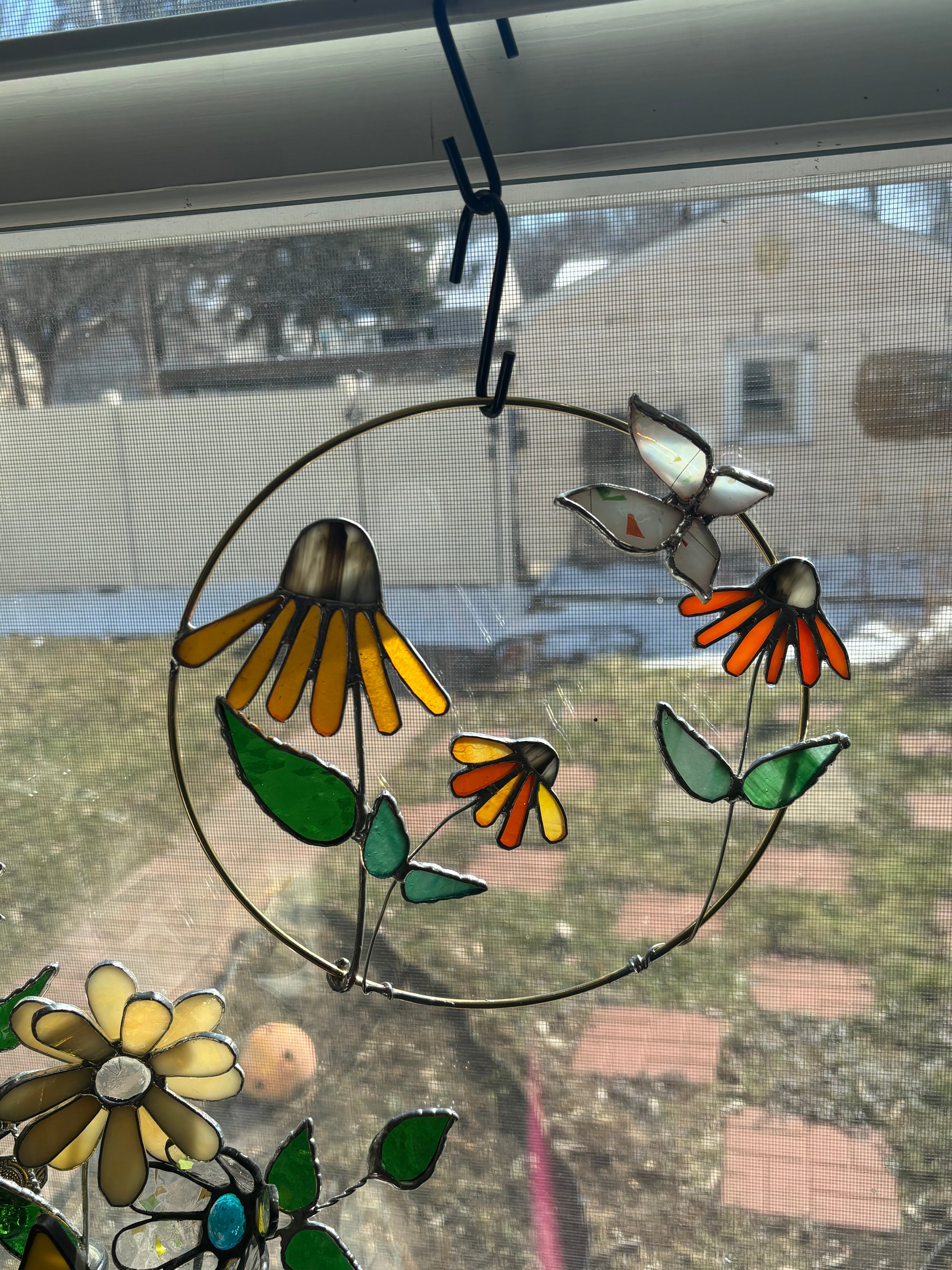 Large 12” hoop with 4 full flowers and 3 buds with beautiful Fremont glass butterfly