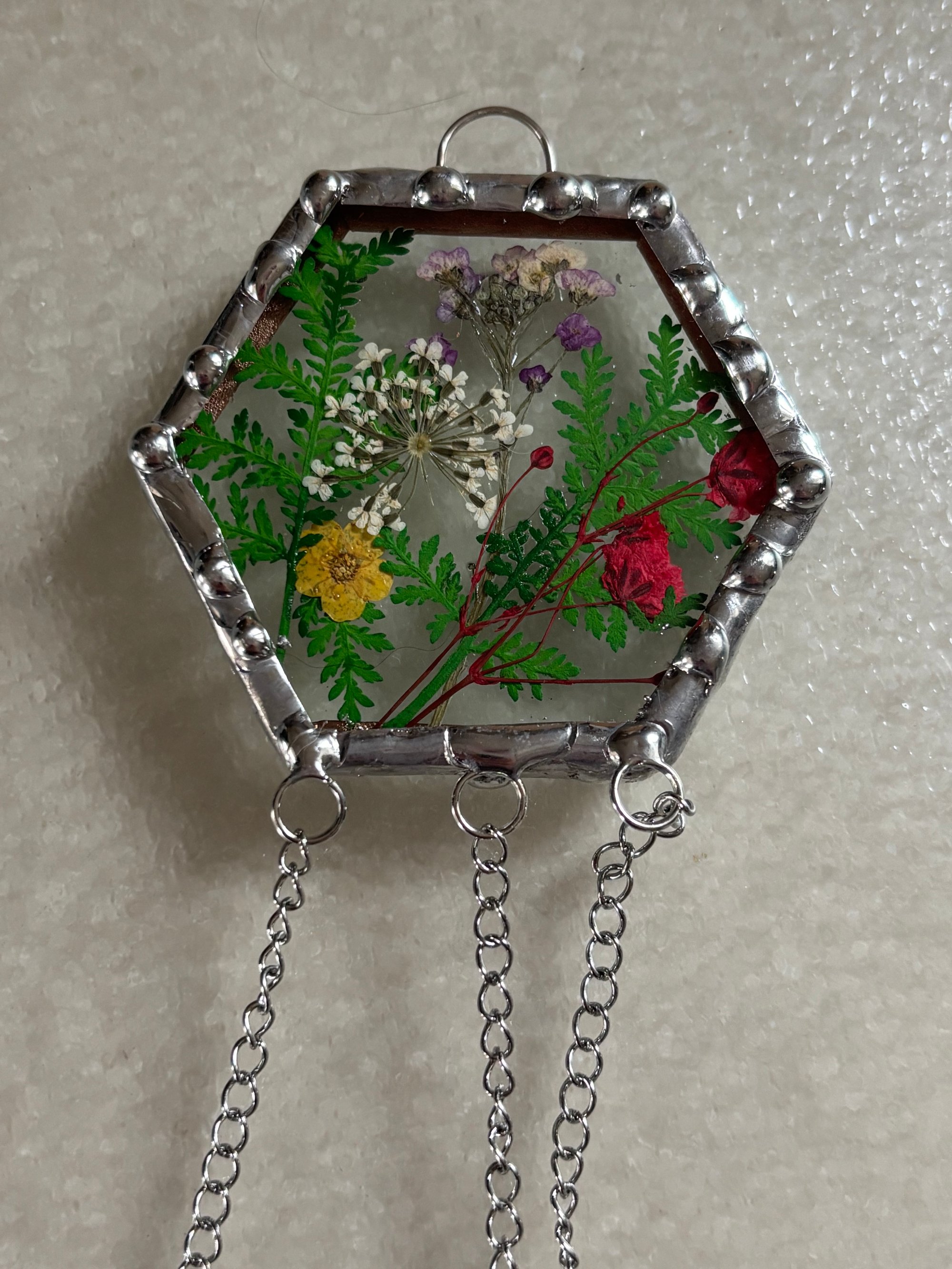 Hexagon with dried flowers and butterfly charms