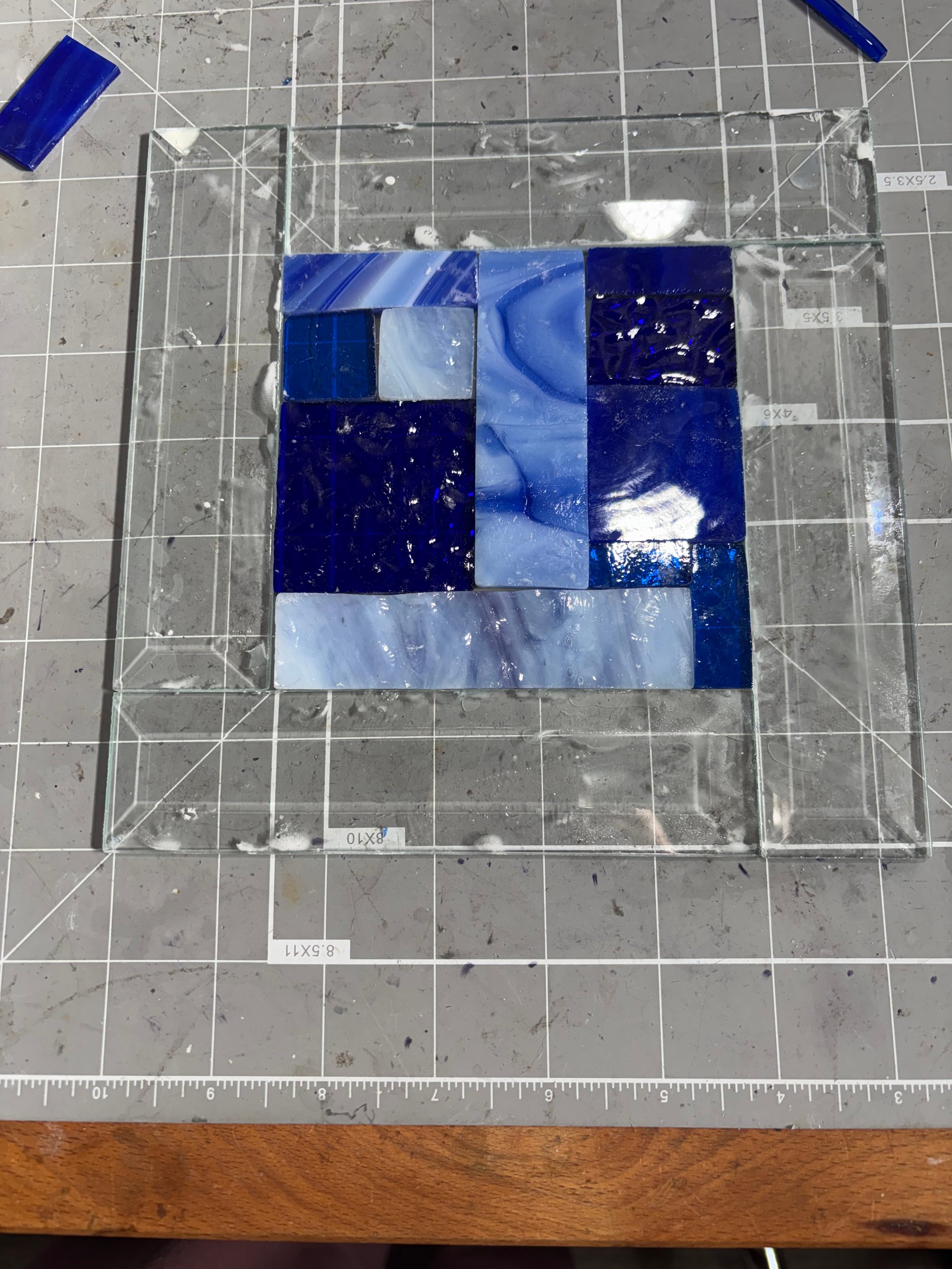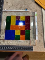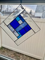 ~7” bevels surround geometric pattern one with blue shades and one with primary colors (PRIDE)