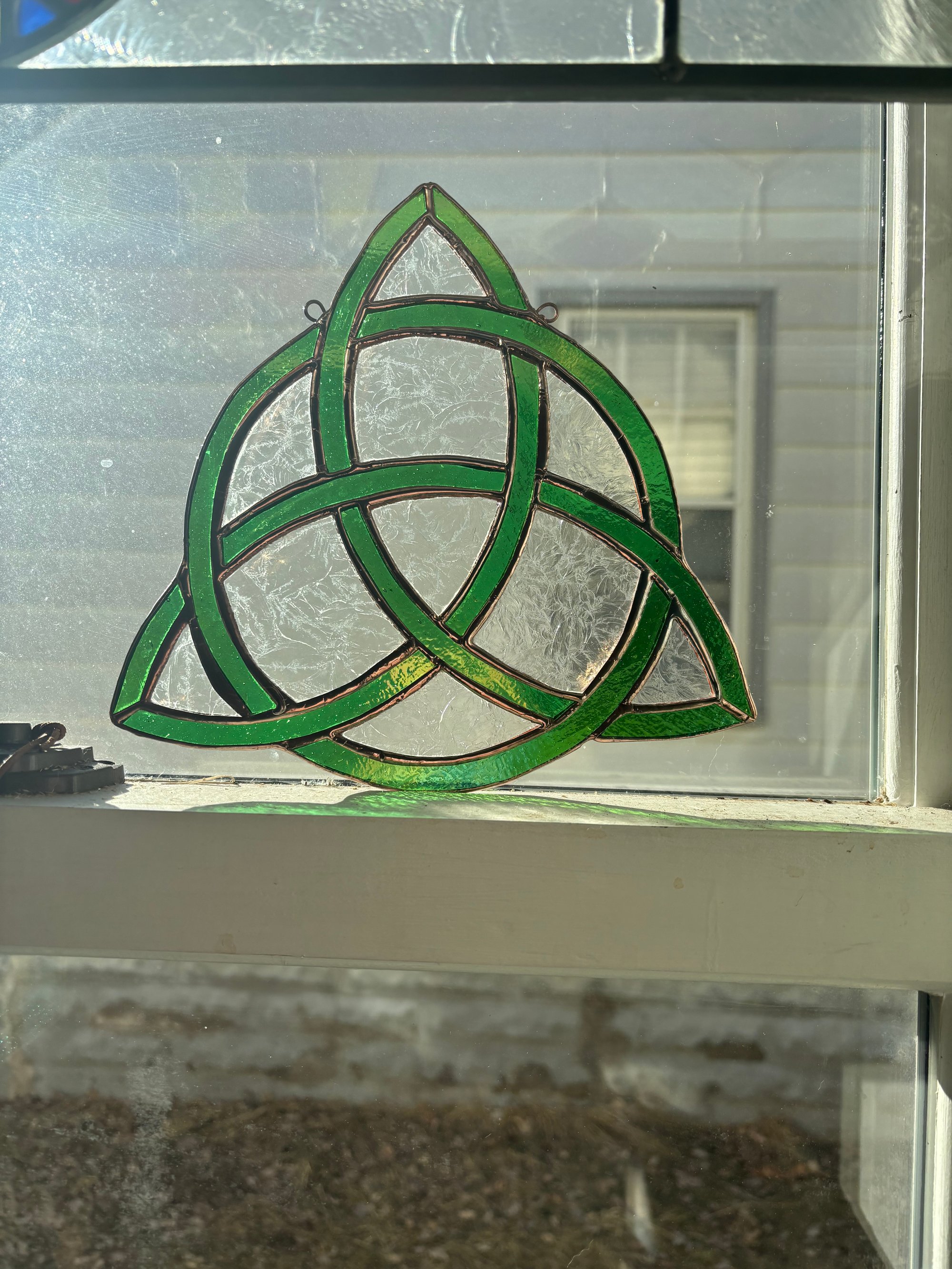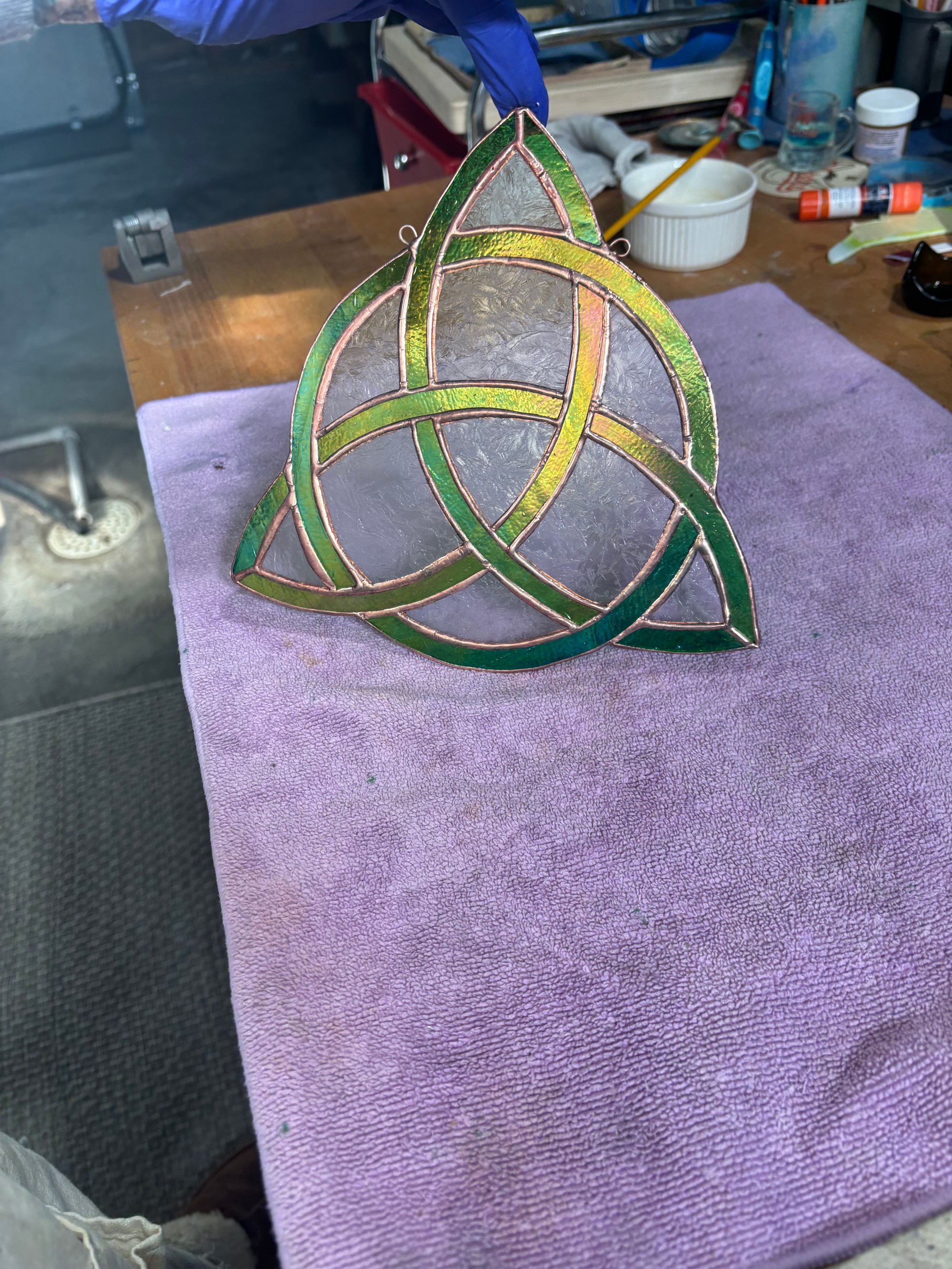 8.5x8.5 iridescent green with glue chip clear and copper patina