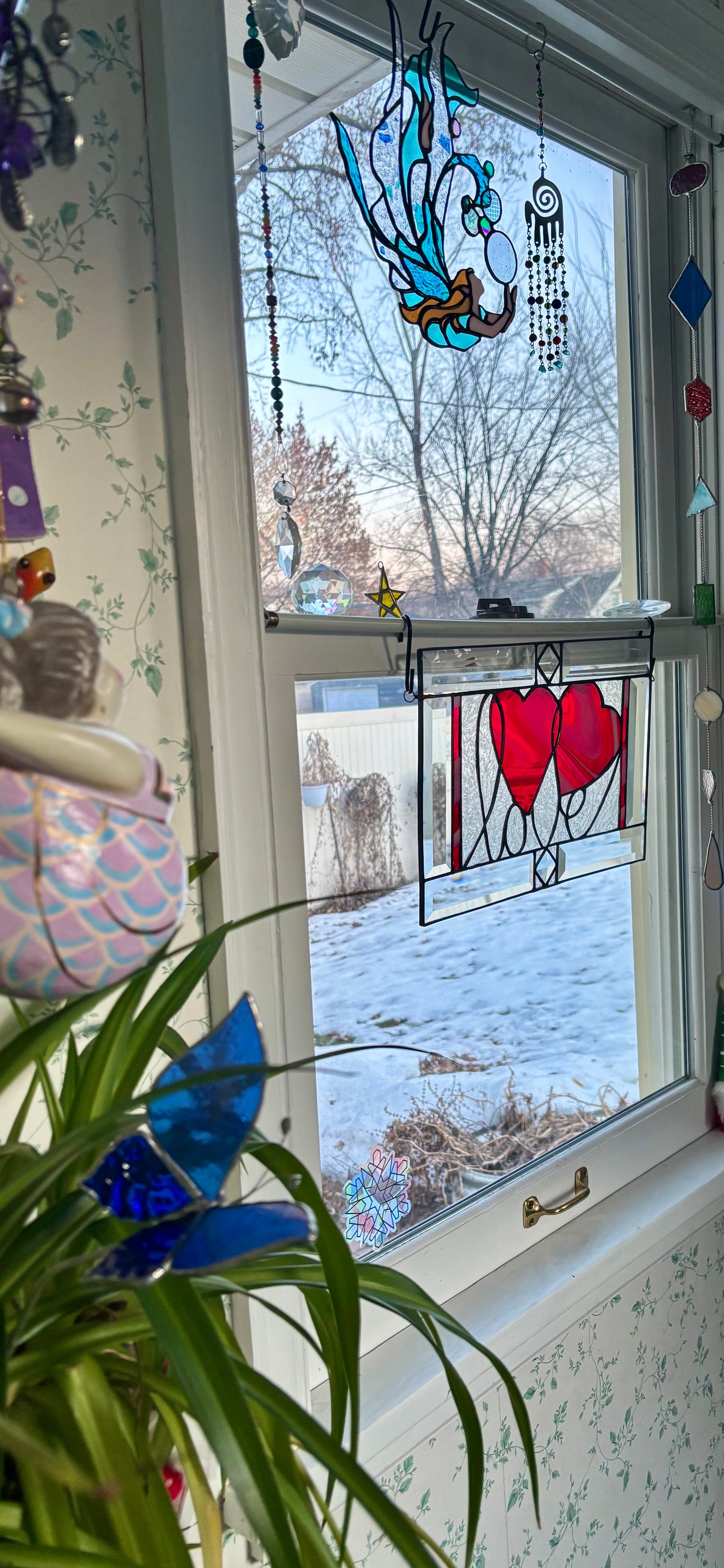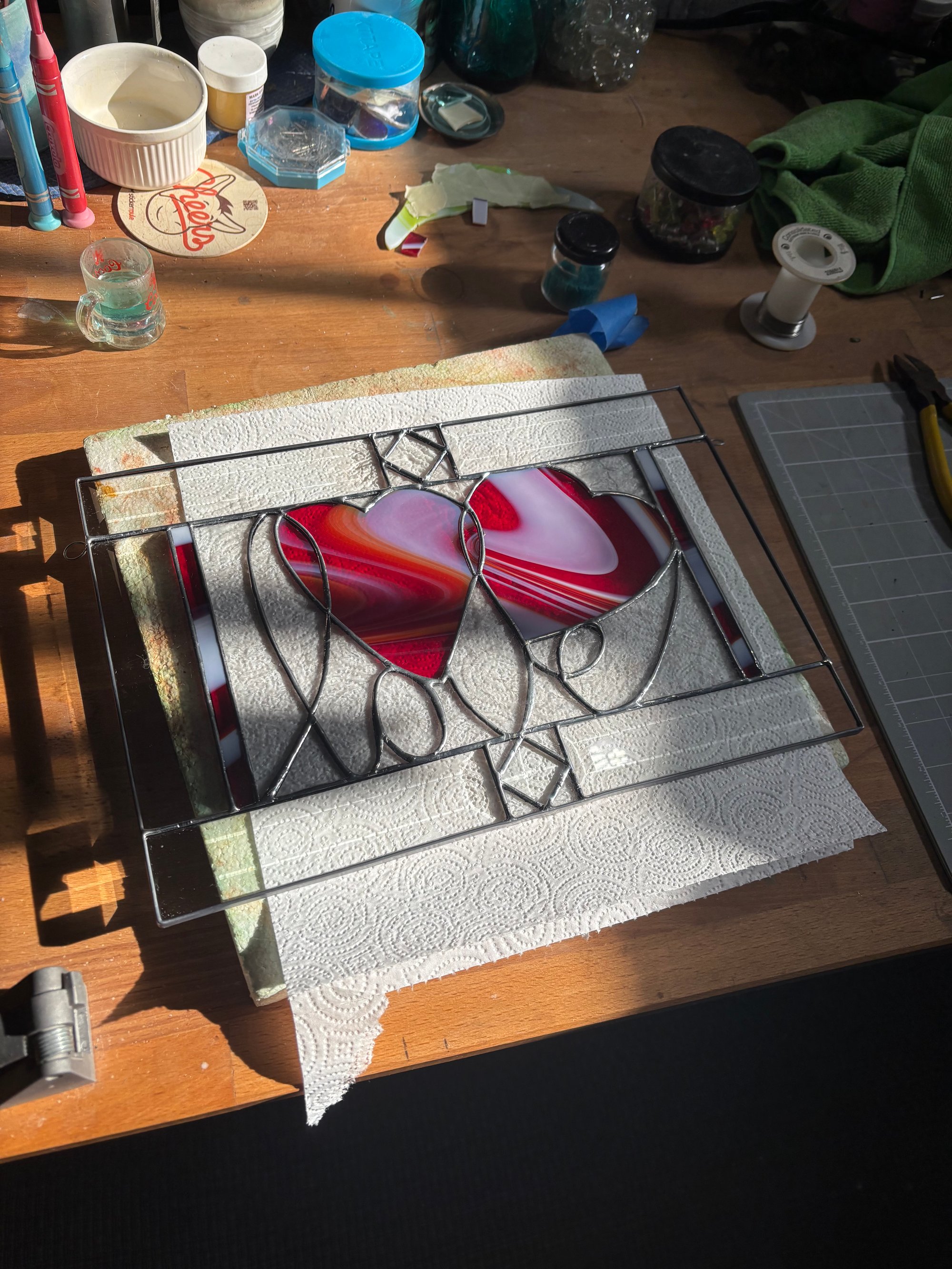 Baroque red glass with white and orange swirls, glue chip clear glass and bevels. Measures 13.5x9